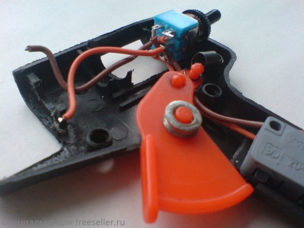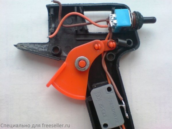 6-контактный переключатель был установлен в заднюю часть корпуса, микропереключатель разместился под курком пистолета. Сделаны электрические соединения.