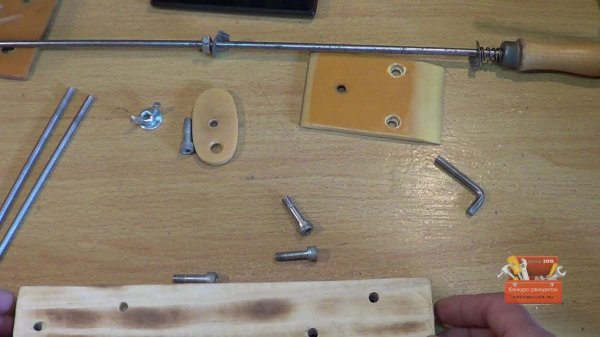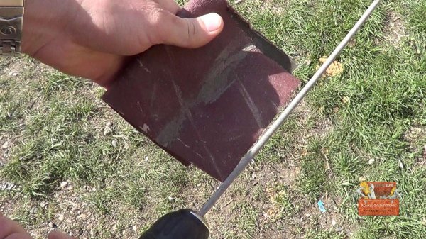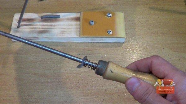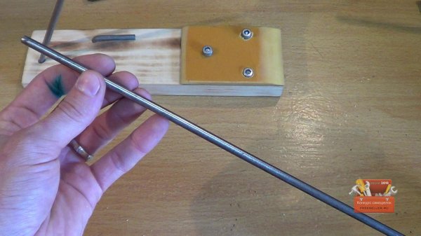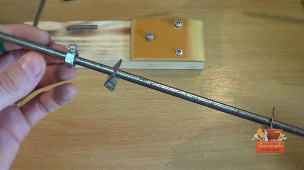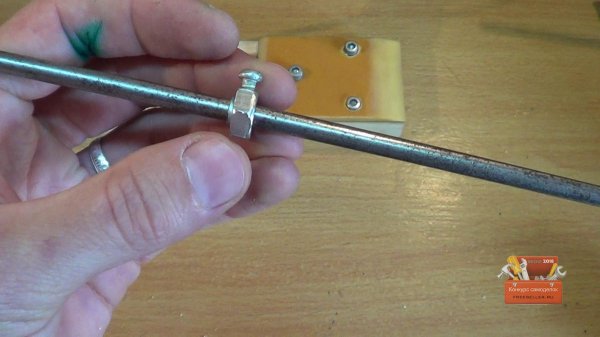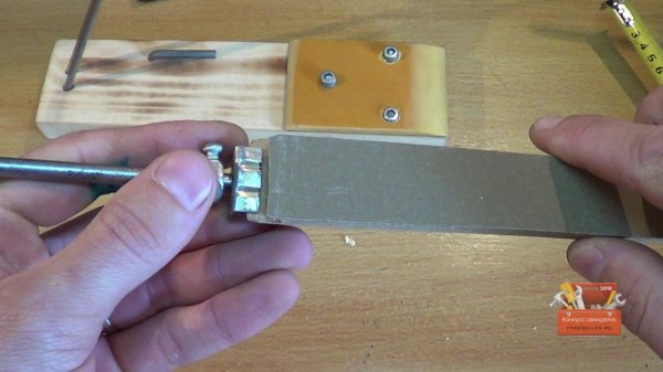 Основную направляющую сделал из стального прутка длинной 56 см. На него с одного конца одел ручку от старого напильника, что бы удобнее было работать. Зажимные уголки сделал из старого хомута, просто согнул его и просверлил по отверстию. Эти уголки держит гайка с нарезанной резьбой для зажимного винтика, а так же установил пружину, что бы можно было быстро менять камни.