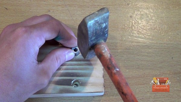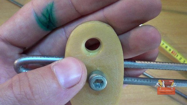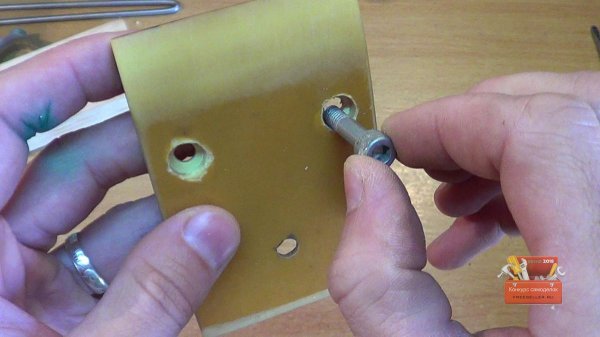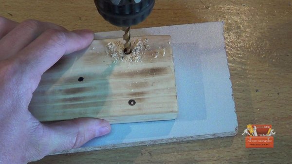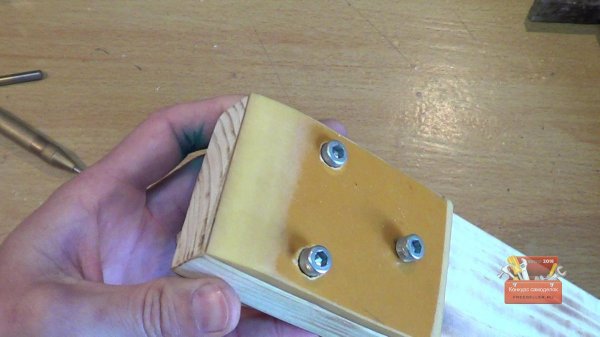 Затем просверлил отверстия в прижимной пластине и деревянной стойке. В пластине сделал небольшой патай, что бы винтики как можно глубже садились в нее, а в стойке запрессовал гайки.