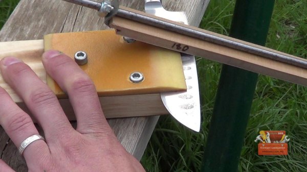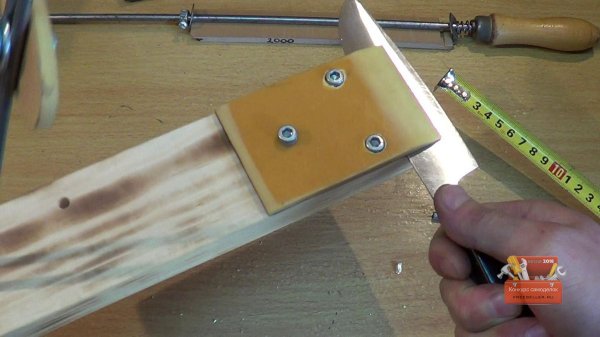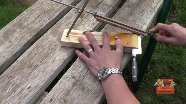Вот точилка и готова. Теперь необходимо протестировать ее. Зажимаем нож и начинаем точить.![]()