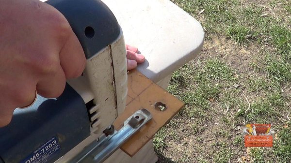 Далее просверлил два отверстия в направляющей пластине, причем на одном из них снял фаску, что бы увеличить угол хода точильной направляющей.![]()