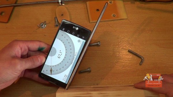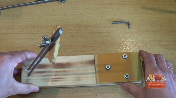 Эту пластинку при помощи того же винтика и барашка ставим на направляющую и зажимаем. При помощи этой пластинки, можно довольно точно выставлять необходимый угол заточки.