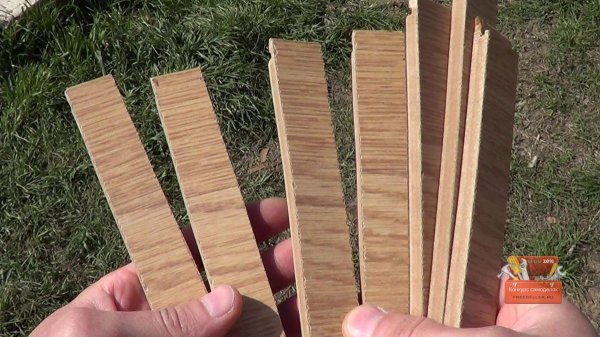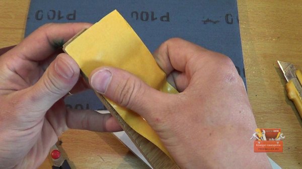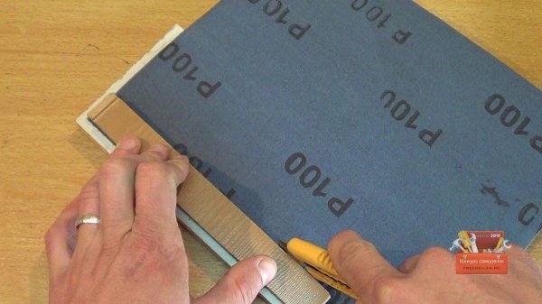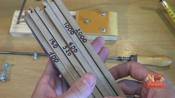 "Камни" были сделаны из обычного куска ламината. Расчертил на полоски шириной примерно 2-2,5 см и длинной в 20 см. Эти отрезки уже имеют выступы по краям, поэтому больше ничего вырезать не пришлось. Данный "камень" плотно зажимается в направляющей, но в то же время его легко снять и поставить новый. На полоски ламината наклеил двухсторонний скотч и на него наклеил наждачную бумагу, разной зернистости и каждый сбоку подписал. ![]()