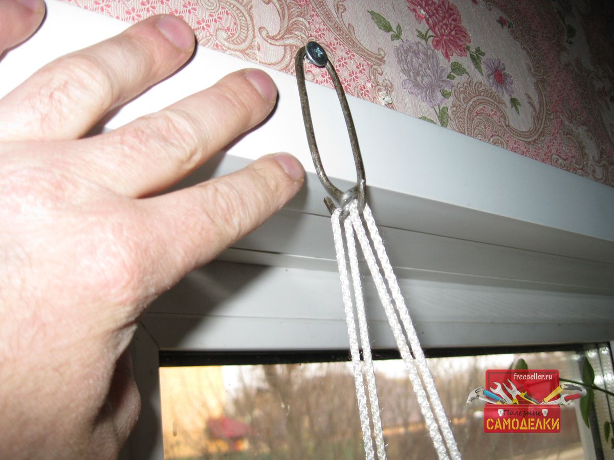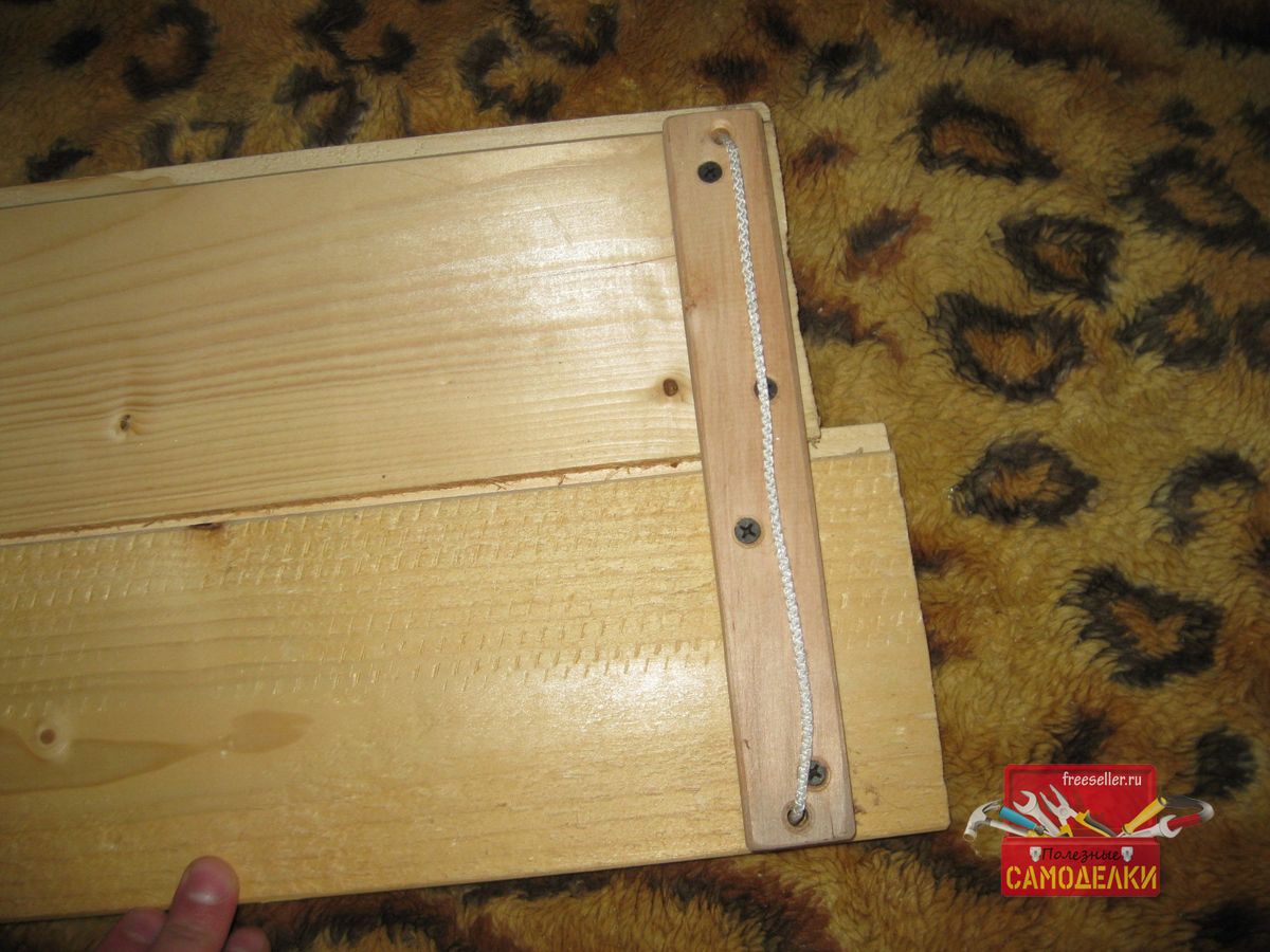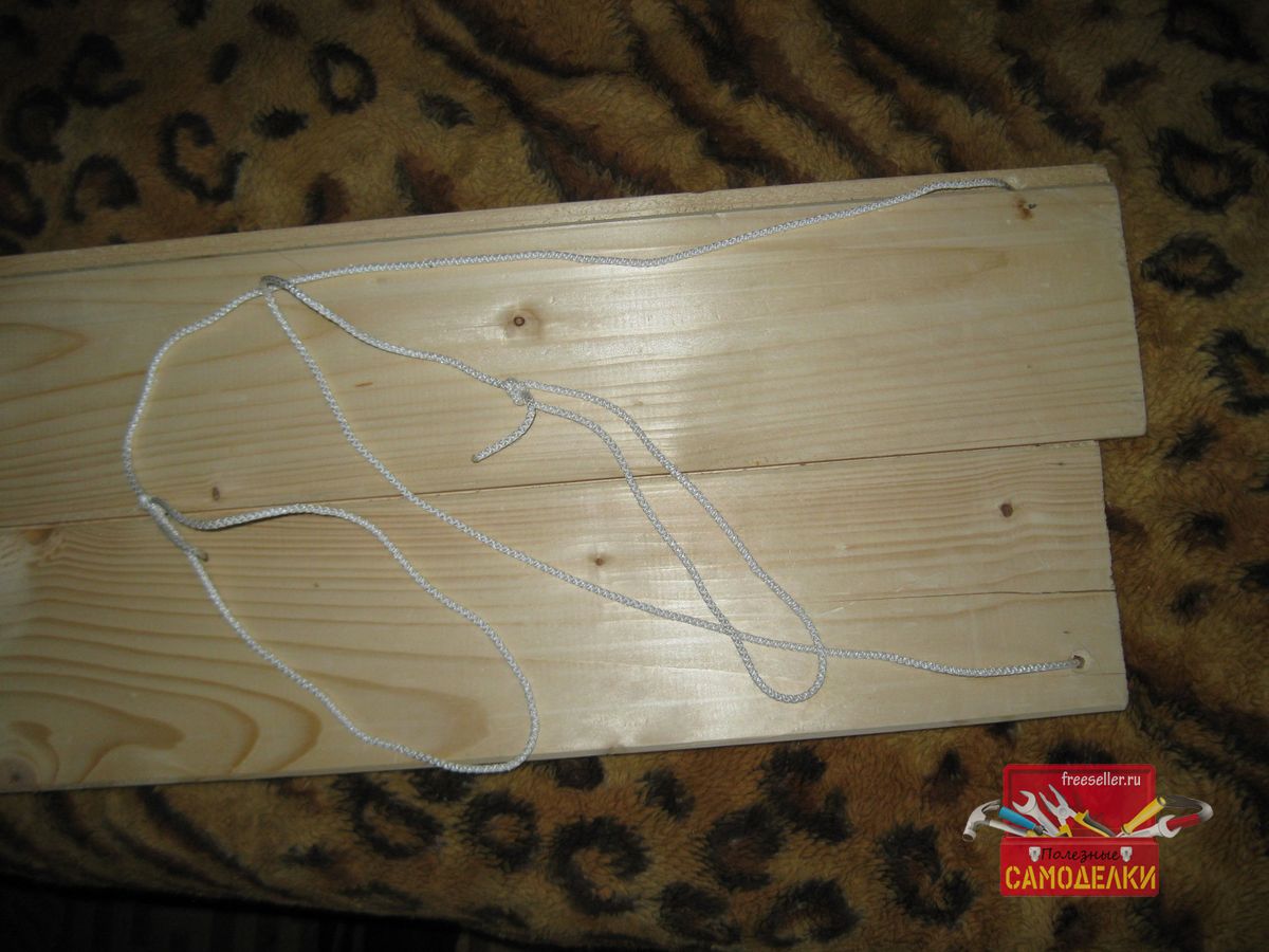 Затем в отверстия полки, с каждой стороны, продел по прочной веревке, завязав на ее концах незатягивающиеся петли.