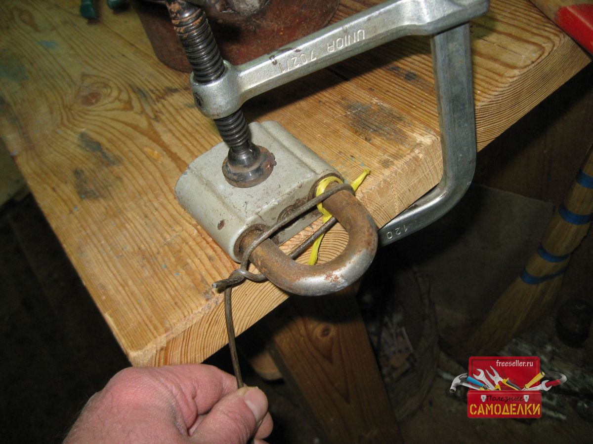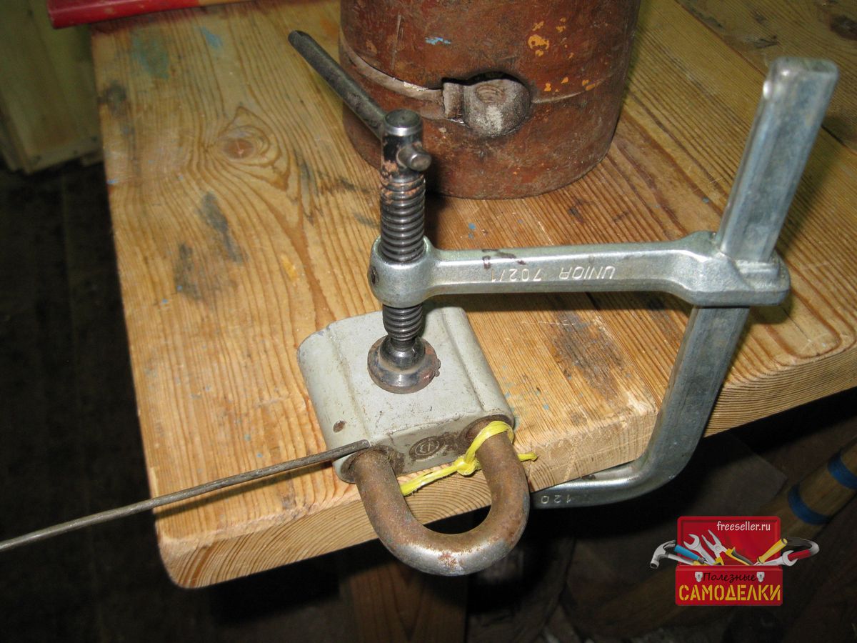 Затем, мне понадобилась оправка, в качестве которой, я решил использовать дужку обычного, навесного замка. Этот замок, я закрепил на верстаке при помощи струбцины.