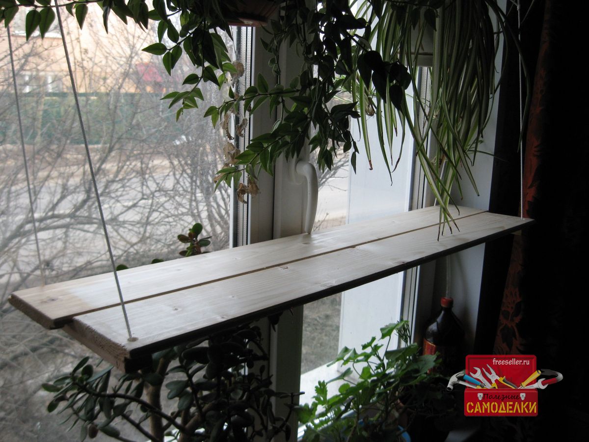 Причем эту полку, я сделал не на все окно, а только на две трети ширины окна, чтобы можно было открывать хотя бы одну створку окна. А саму полку изготовил из двух отрезков вагонки и деревянной планки, то есть из самых первых материалов, которые попали мне под руку в мастерской.