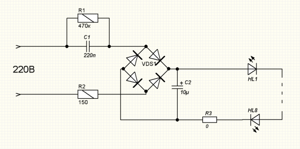 Сейчас светодиодные лампочки продаются в большом количестве. Цена становится все доступней. Но ничто так не приятно эксплуатировать, как изделие сделанное своими руками. Самая простая схема, это схема с гасящим конденсатором.