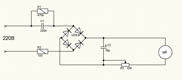 Конденсатор С1 является ограничителем тока, R1 необходим для разрядки конденсатора. Резистор R2 выполняет защитную роль, ограничивая ток в схеме во время заряда конденсатора. На диодах собран выпрямитель. Конденсатор С2 сглаживает пульсации. Резистор R3 с сопротивлением 0 ом.