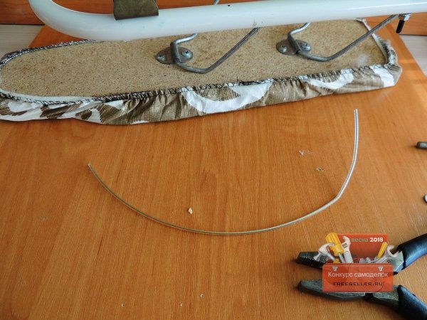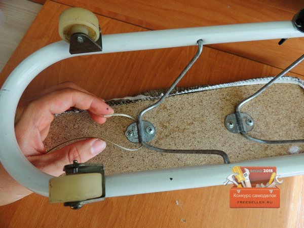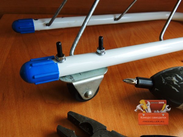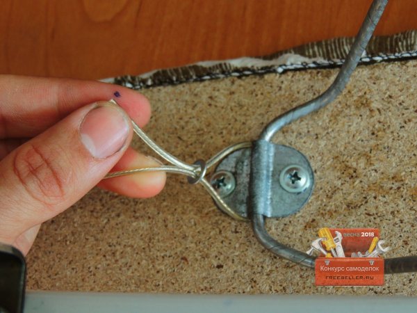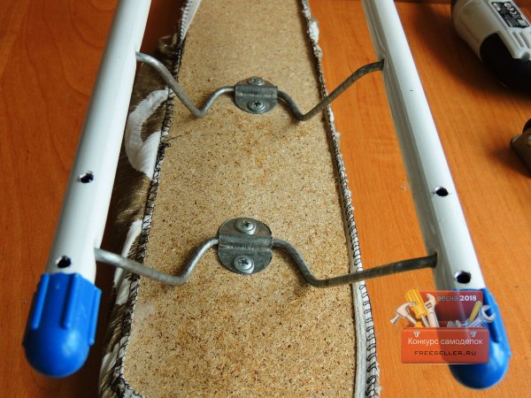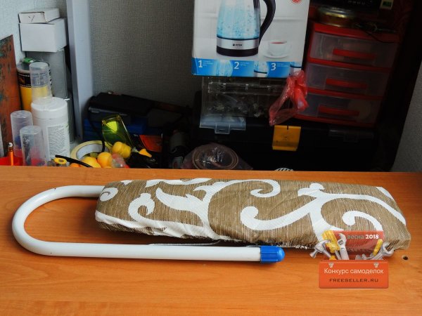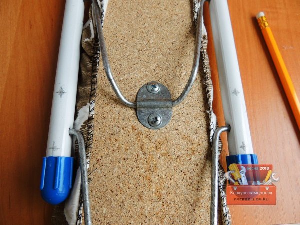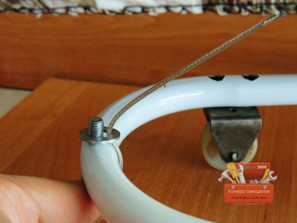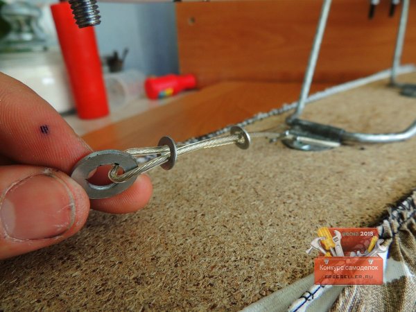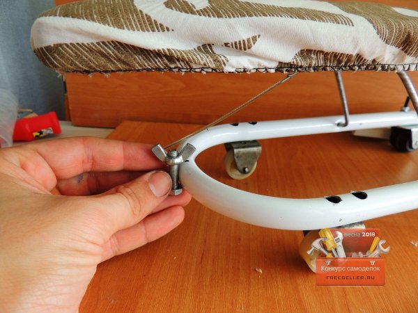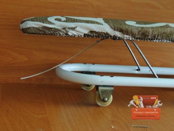 Так как гладильная доска могла случайно сложиться, я придумал небольшой натяжной механизм из тросика от бельевой веревки.![]()