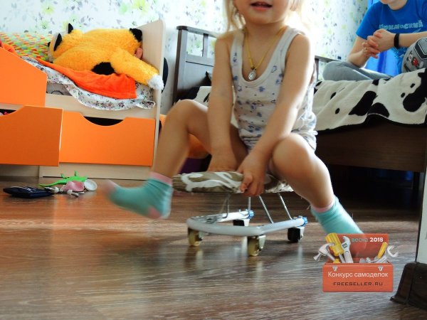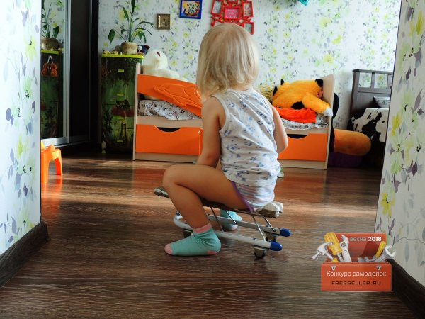 Моя маленькая дочь весь процесс создания самоделки просидела возле меня, уж очень ей было интересно, что я там такое делаю. Теперь ездит на нем по всей квартире не слезая с него, а на купленный в магазине авто-толокар практически не садится, такие вот дела.![]()