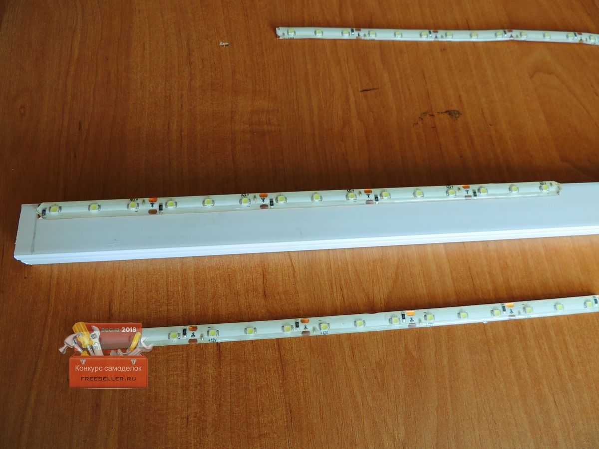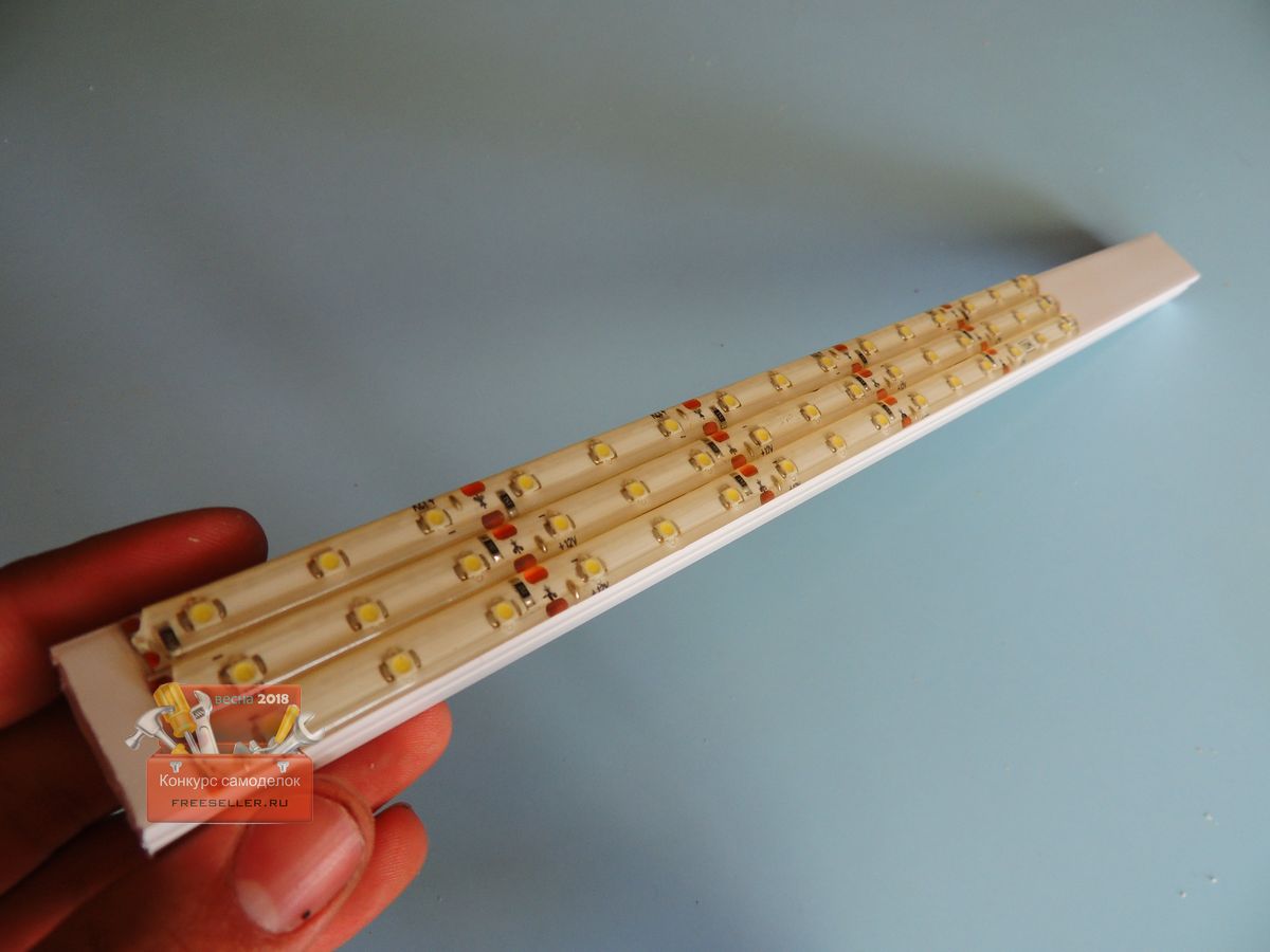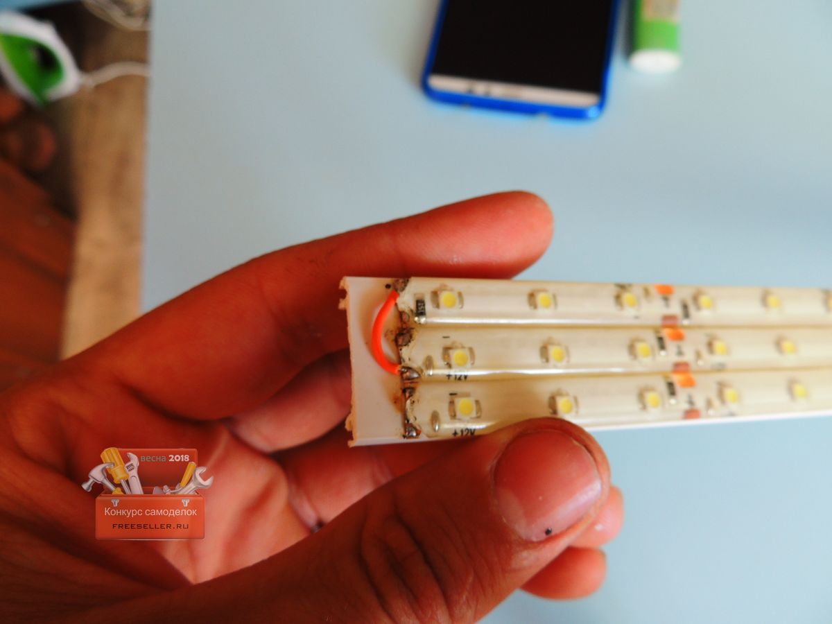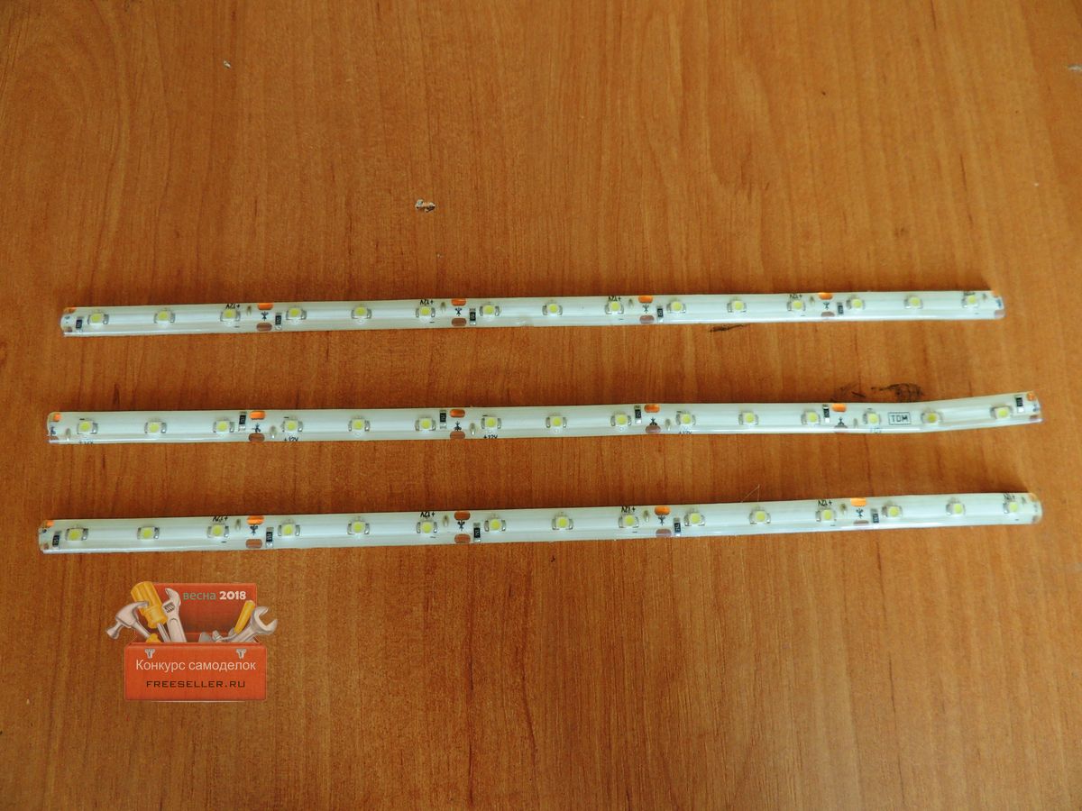 Далее в качестве освещения решил применить светодиодную ленту, нарезал три куска по 25 см.![]()