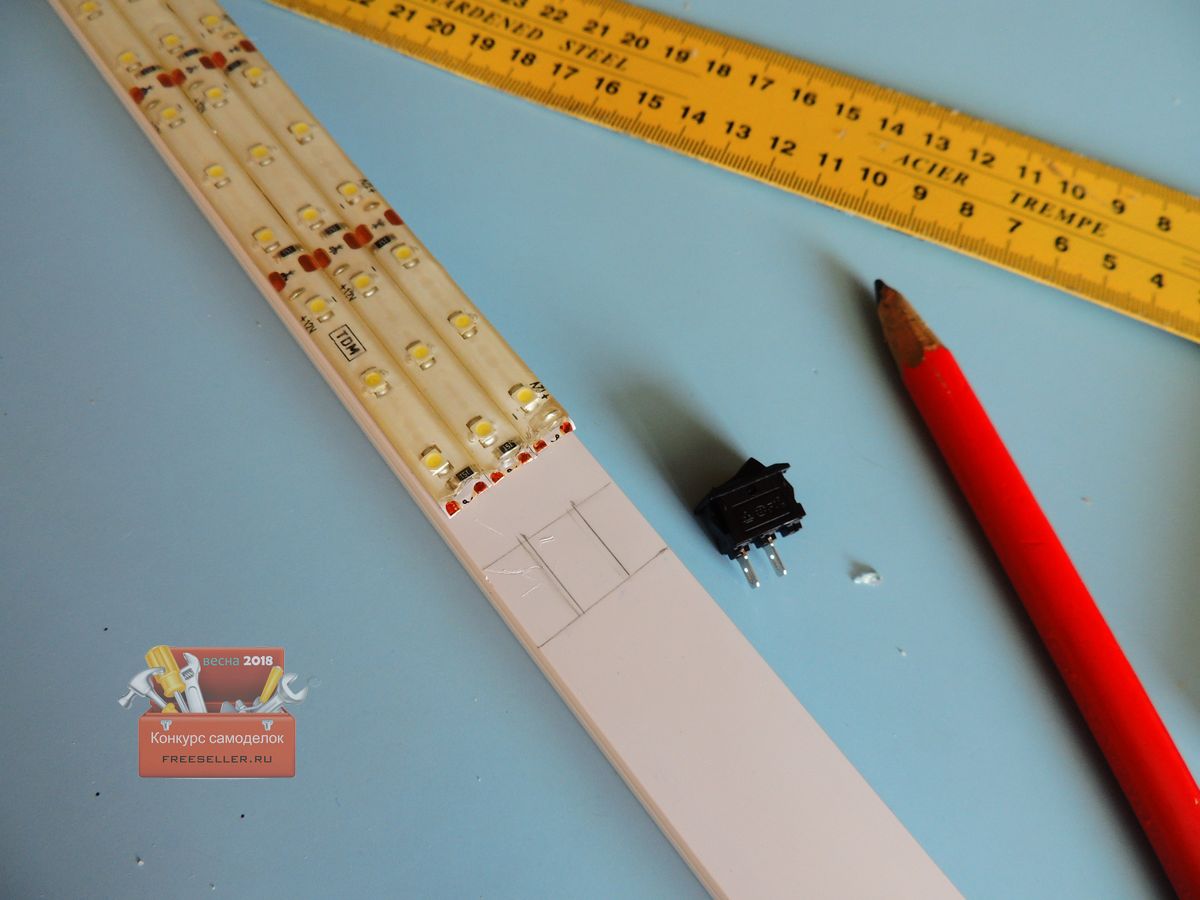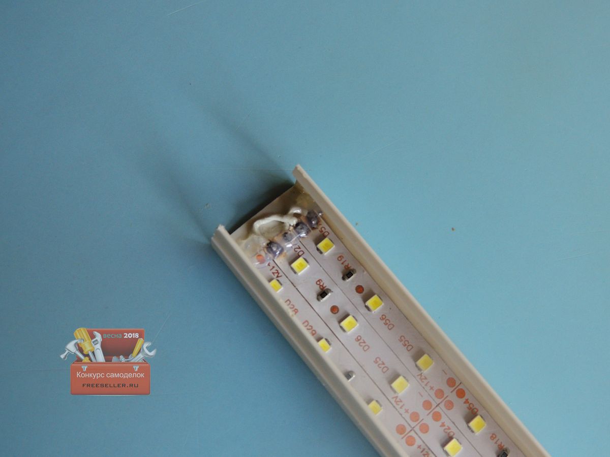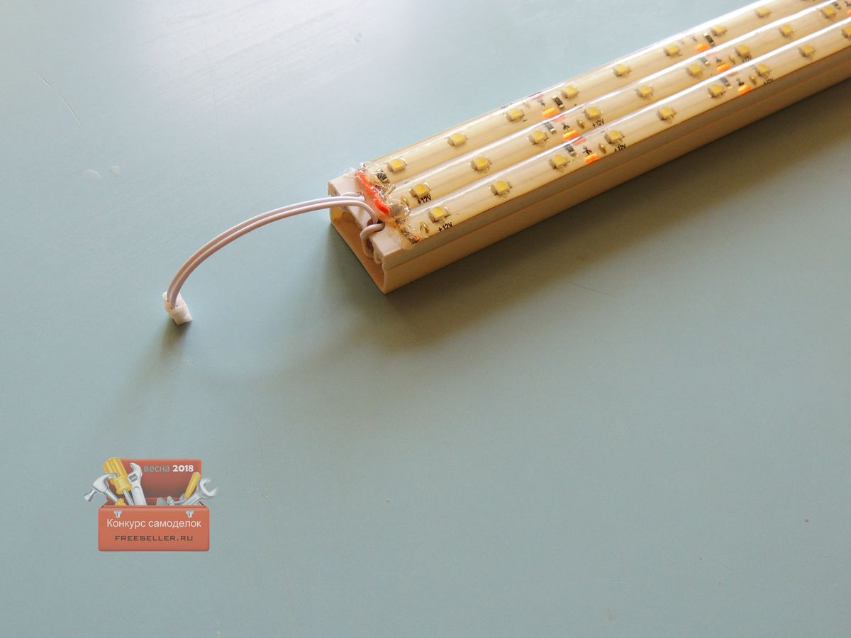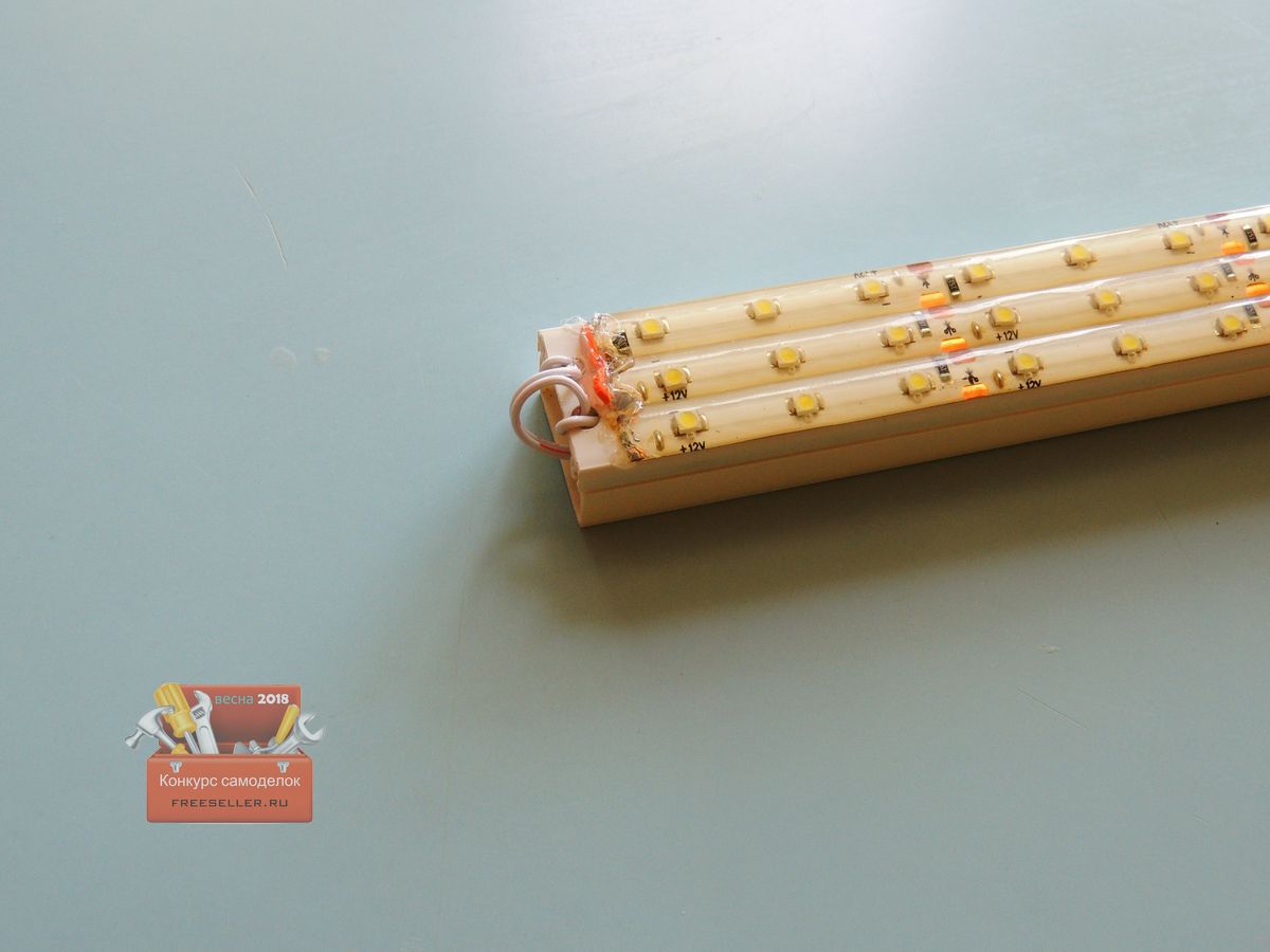 Далее в качестве освещения решил применить светодиодную ленту, нарезал три куска по 25 см.![]()