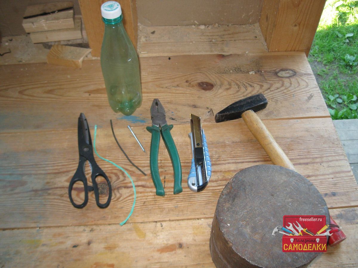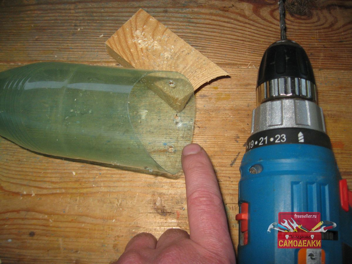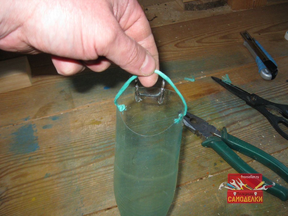 После этого, просверлил четыре отверстия в пластиковой бутылке для закрепления шпагата и специального крепления из проволоки.