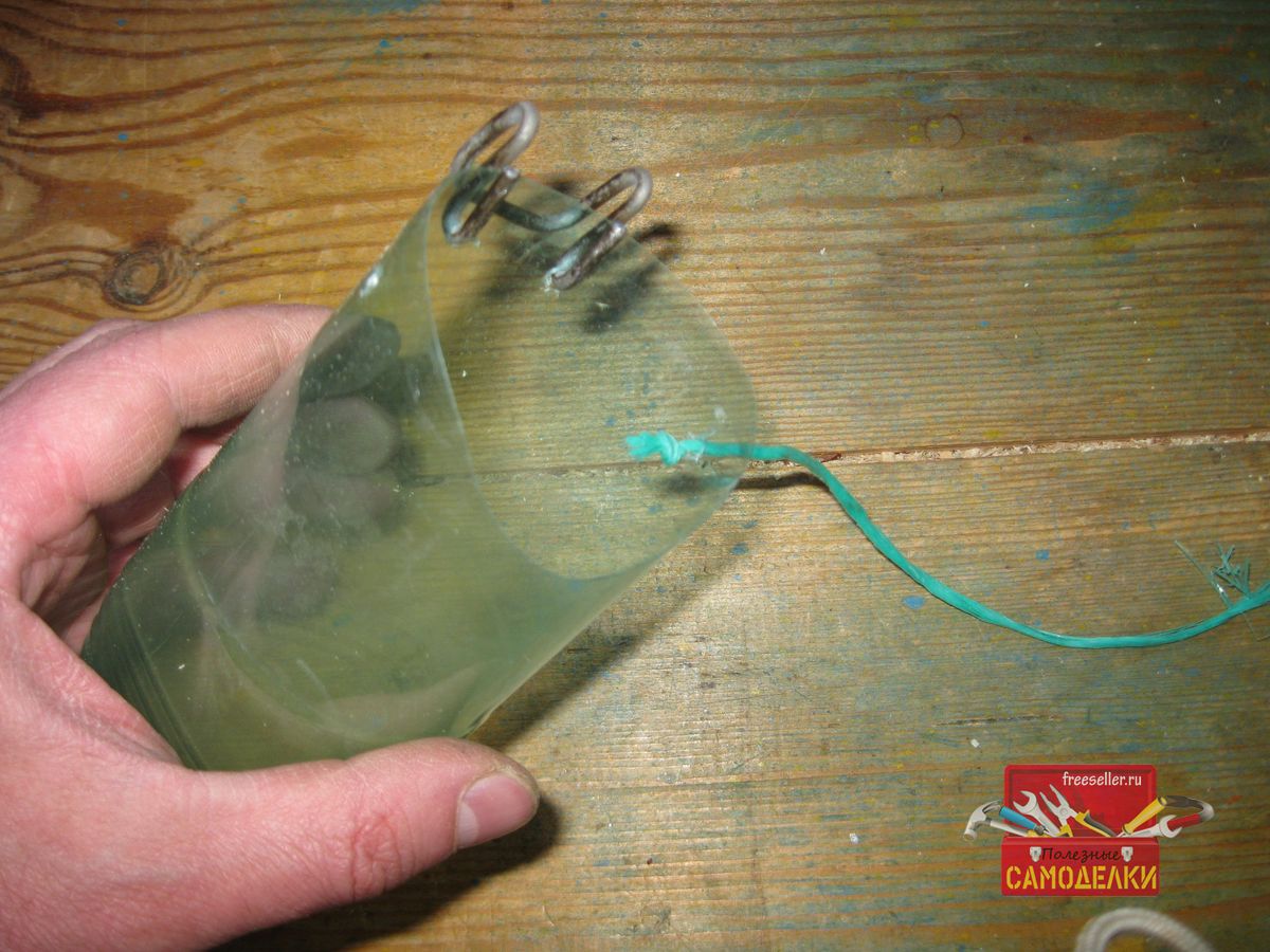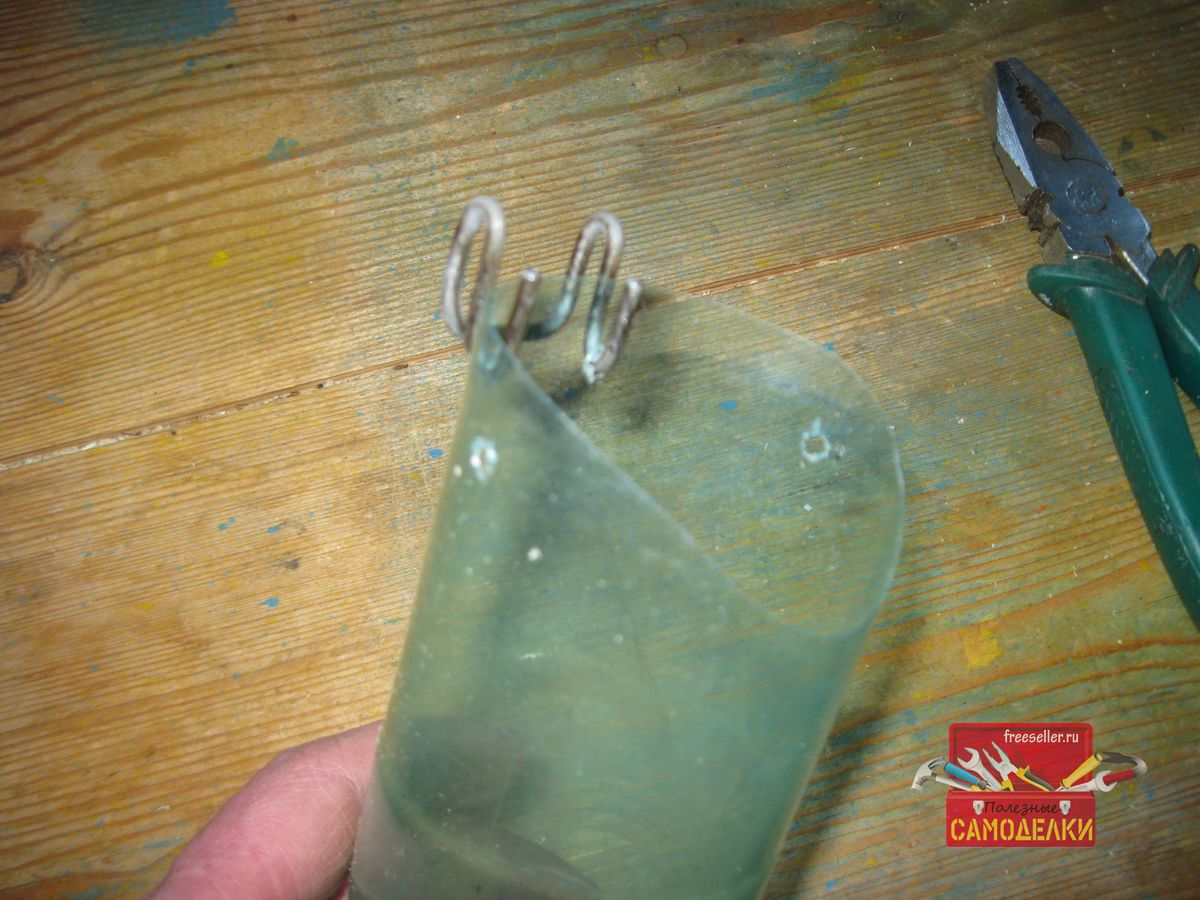 После этого, вставил кончики крючка в отверстия бутылки и обжал их пассатижами.
