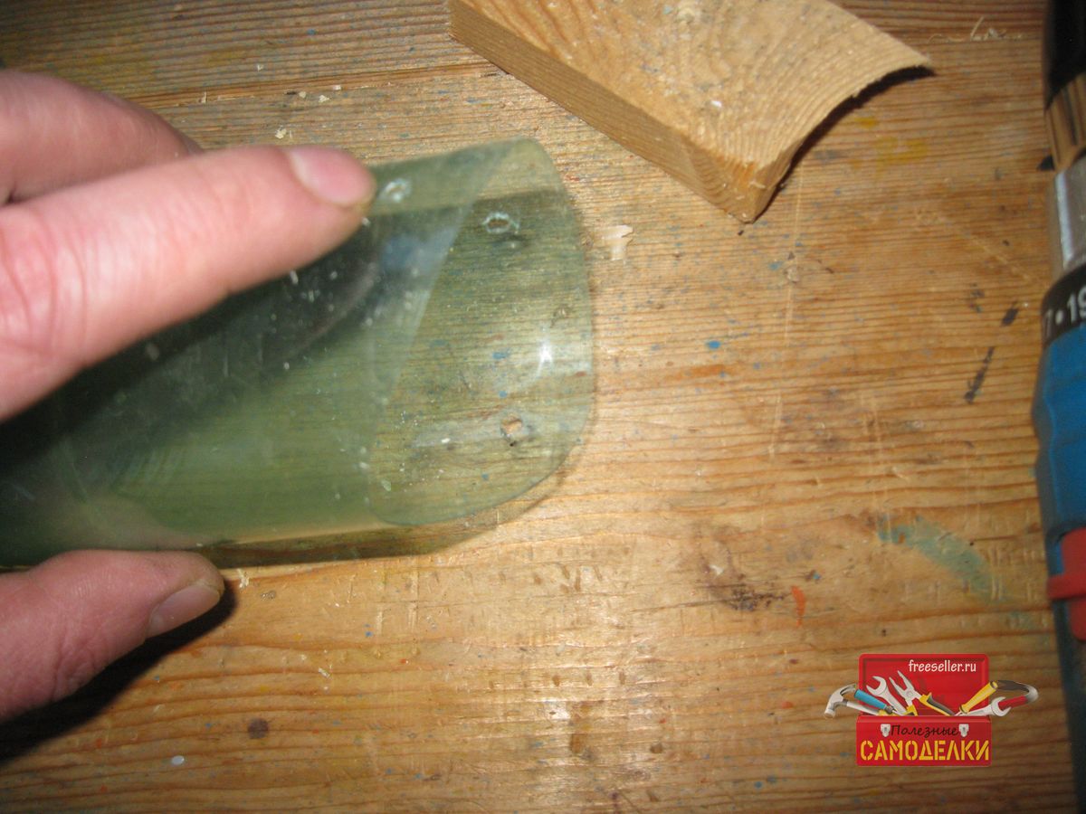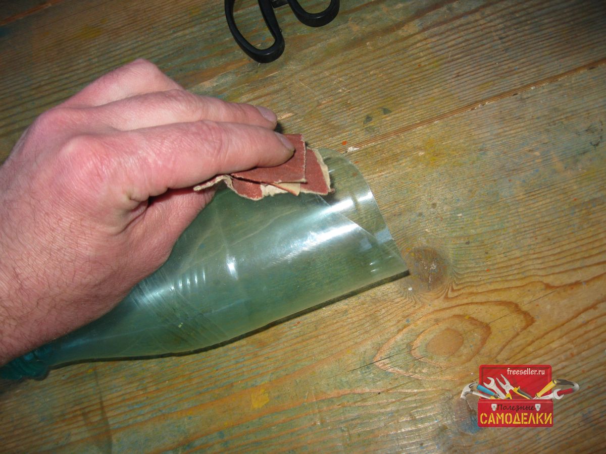 При помощи ножниц, выровнял срез и сделал небольшую выемку с лицевой стороны, а затем тщательно обработал срез бутылки мелкозернистой наждачной бумагой.
