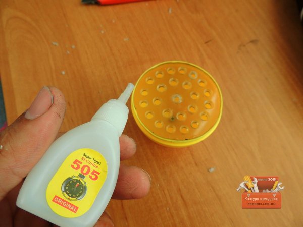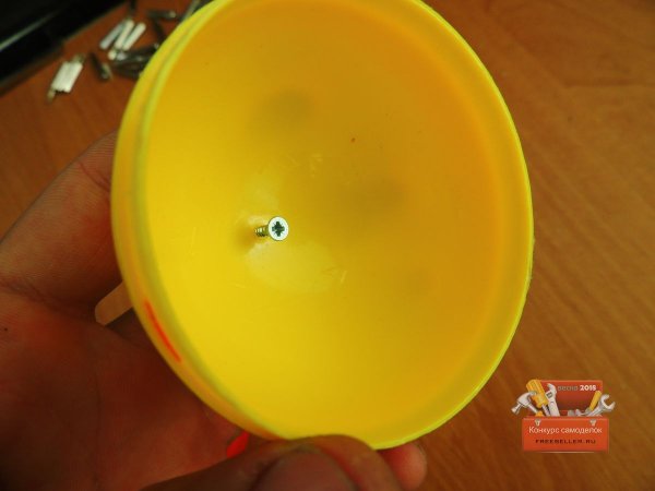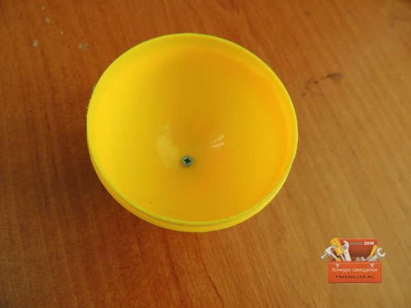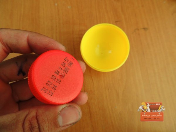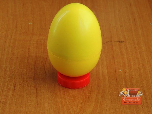 Далее принялся делать подставку для яйца, так как оно очень не устойчиво, для этого взял крышку от молока и соединил с нижней частью яйца.![]()