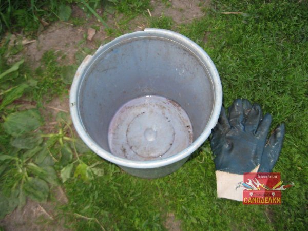 Однако мне пока много не надо, поэтому я взял старое пластиковое ведро емкостью 12 литров. Чистый выход настоя из него получится примерно около 10-11 литров. Как раз хватит на десять садовых поливанов.