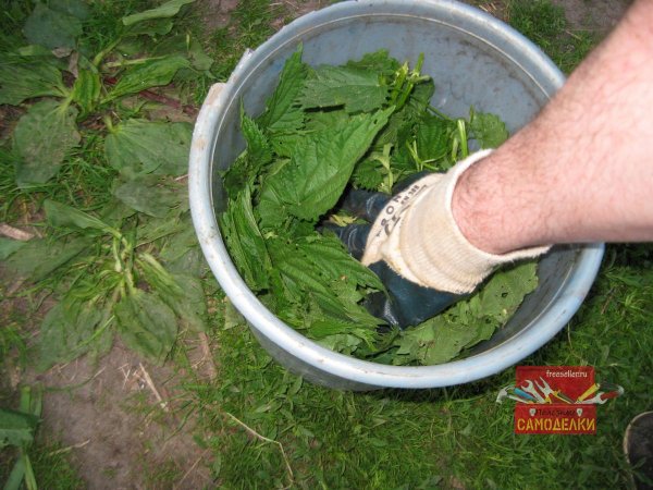 Далее надев перчатки, рвем крапиву.