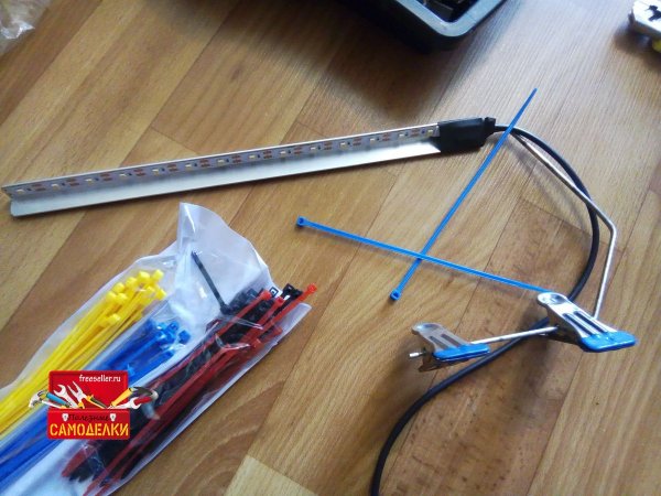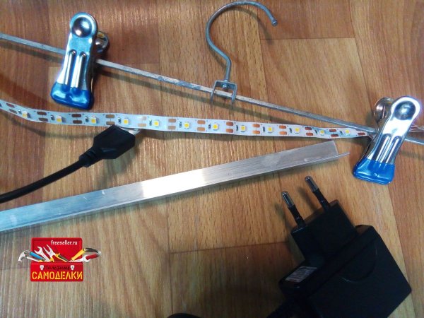 После того, как соединили уголок и держатель с прищепками, можно наклеивать светодиодную ленту. LED- ленту я выбрал питанием 5 Вольт специально для того, чтобы можно было подключать подсветку как от сети, так и от power bank.