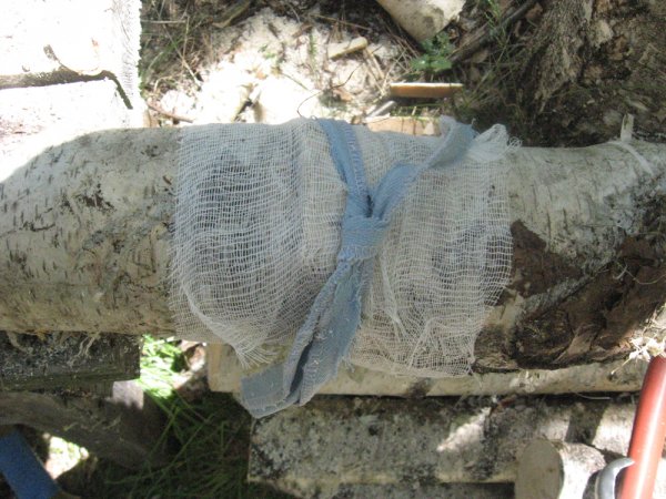Весной на березовых бревнышках делаю запилы уголком. В них укладываю зерновой мицелий. Прикрываю кусочком выиленной древесины и завязываю бинтом, чтоб не вывалилось.![]()