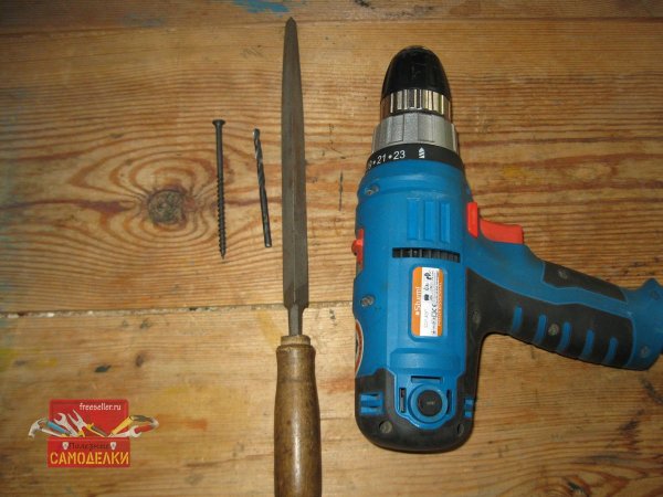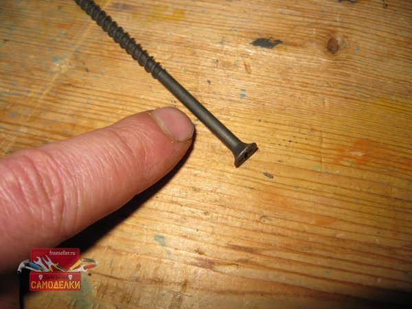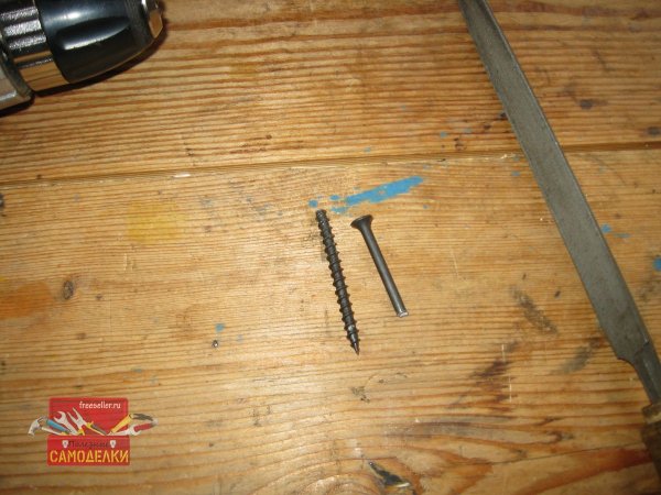 Вначале хочу отметить, что я специально взял вот такой длинный саморез с гладким участком без резьбы. Благодаря этому, его будет очень удобно зажимать в патроне электродрели.