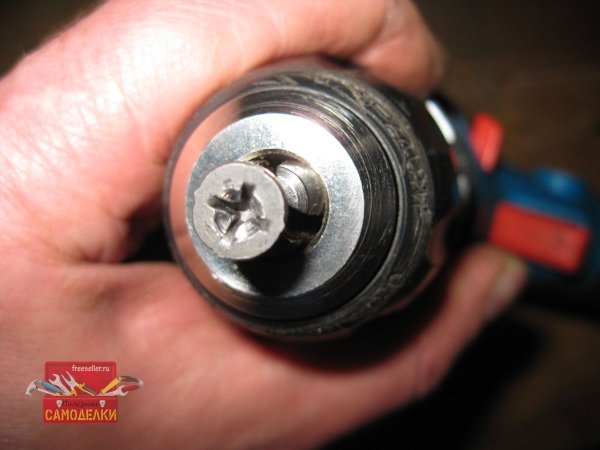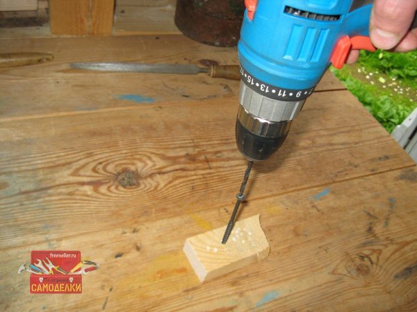 Сначала слегка рассверлим головку самореза по центру крестообразного шлица. Это удобно делать, если слегка завернуть сам саморез в небольшую дощечку.