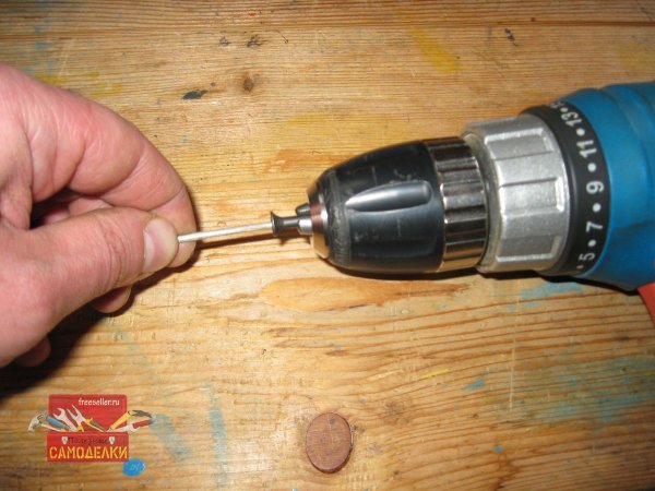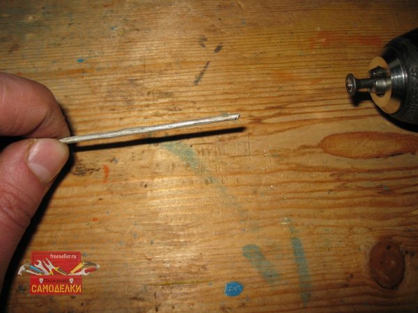 Кончик проволоки вставляем в углубление головки самореза, примерно так, как карандаш в электроточилку и включаем дрель на высоких оборотах.