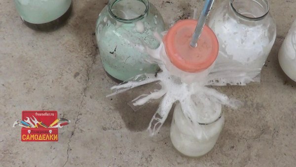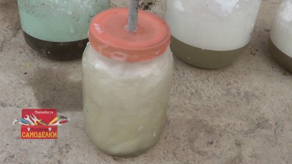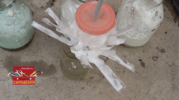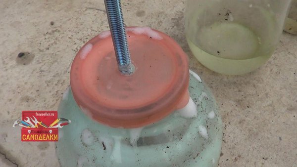 Ну а теперь самое интересное, это испытание самоделки! Наливаем в каждую банку немного воды, добавляем моющего средства, вставляем шпильку в шуруповерт, а ершик из бутылки в банку, закрываем крышку и начинаем мыть.