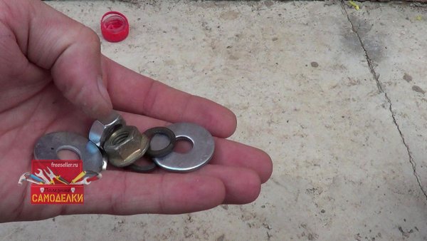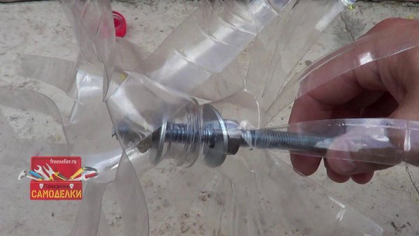 Затем берем шпильку, накручиваем на нее гайку с шайбой, одеваем одну из обрезанных бутылок, далее одеваем вторую и все это затягиваем при помощи второй гайки. Немного "распушиваем" лепестки от бутылки и наша самоделка готова!
