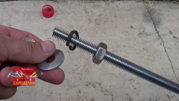 Теперь нужно взять обычную крышку от банки и проделать посередине сквозное отверстие, что бы в нем свободно проходила шпилька.