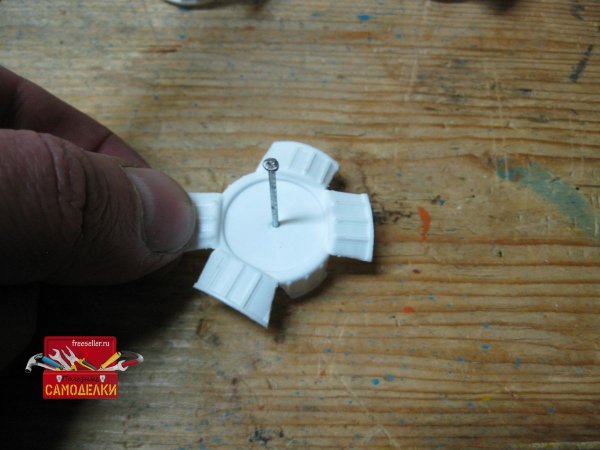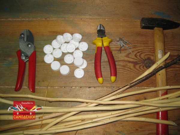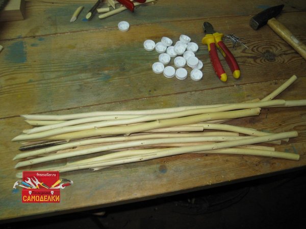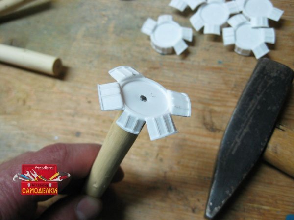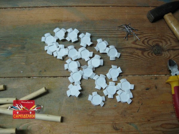 Теперь осталось прибить этих «бабочек» к верхним торцам колышков. Для этого вбиваем в центр каждой крышки гвоздик и прибиваем ее к верхнему торцу колышка. Делается это довольно легко, тем более что сердцевина у колышков из веток довольно мягкая.