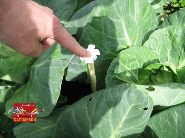 Теперь остается установить их на капустную грядку. Для этого просто втыкаем каждый колышек рядом с растениями капусты.