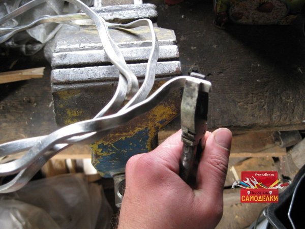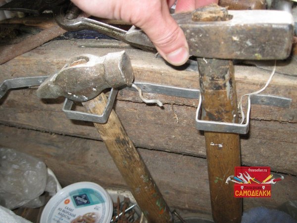 Многие тогда делали из такой полосы различные самоделки, я помню и сам делал из нее разные крючки, ручки на дверцы деревянной теплицы и т.п. А вот отец, догадался сделать из такой полосы довольно неплохие держатели для инструмента.