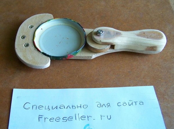 Ну и небольшой бонус. Для отвинчивания крышек меньшего диаметра, предусмотрена вставка, которая изготовляется из полукруга оставшегося после выпиливания выемки упора.
