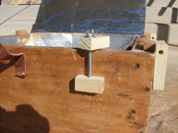Для крепления отражателей были использованы петли. Автор сделал петли из восьми маленьких кубиков вырезанных из бруса 20*20 мм и резьбовых шпилек М8. Гаек барашек и мебельных дюбелей.