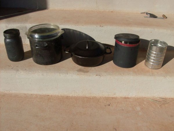 На фото ниже оловянная посуда, которые используются при приготовлении пищи с данной плитой Она окрашена термостойкой черной краской.
