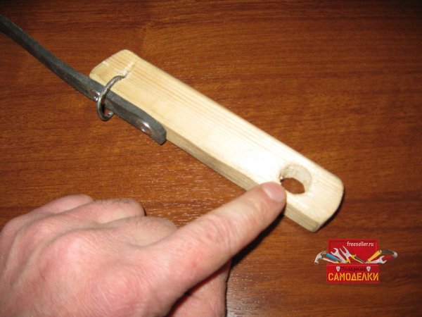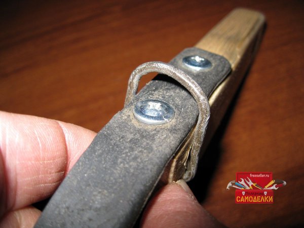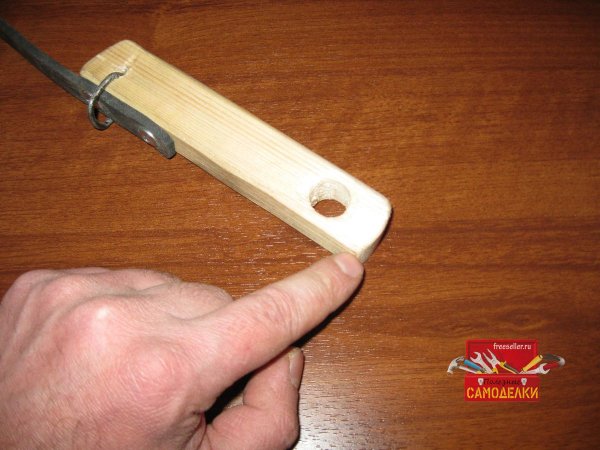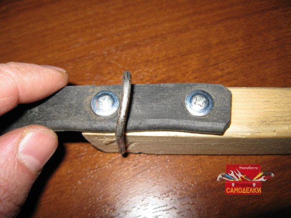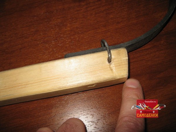 Затем сделал из проволоки скобу с изогнутыми заостренными краями (под углом откусанными пассатижами) и установил эту скобу на передний конец рукоятки, забив в нее острые концы скобы молотком.
