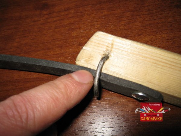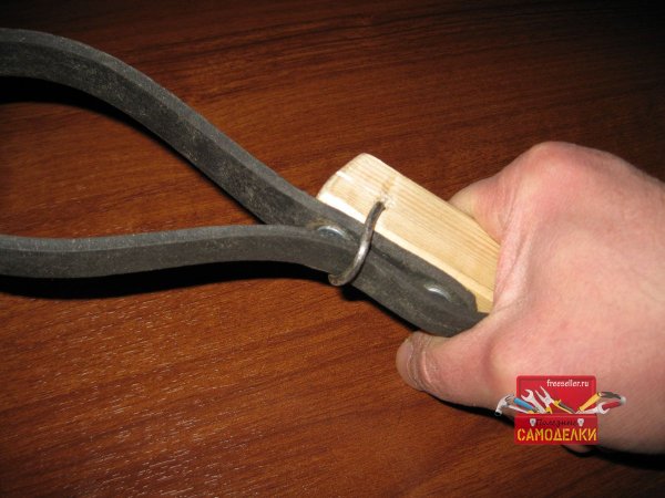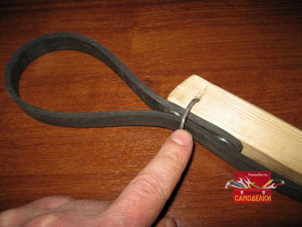В эту скобу я заправил другой конец резиновой полосы, так чтобы из нее образовалась петля.