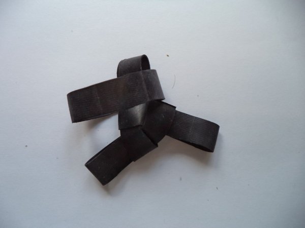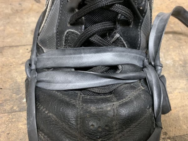 Из остатков велосипедной камеры нарезаем длинную полоску равную диаметру вашей обуви + 15-20 см припуска на завязку.