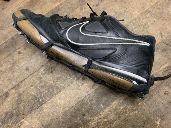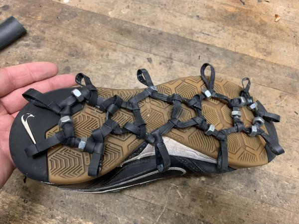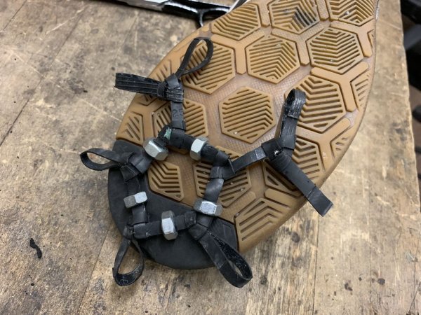 Вместо шипов автор решил использовать гайки М8, 3 гайки размещаются в передней части кошек, и 8 в задней.