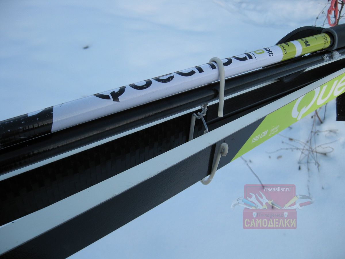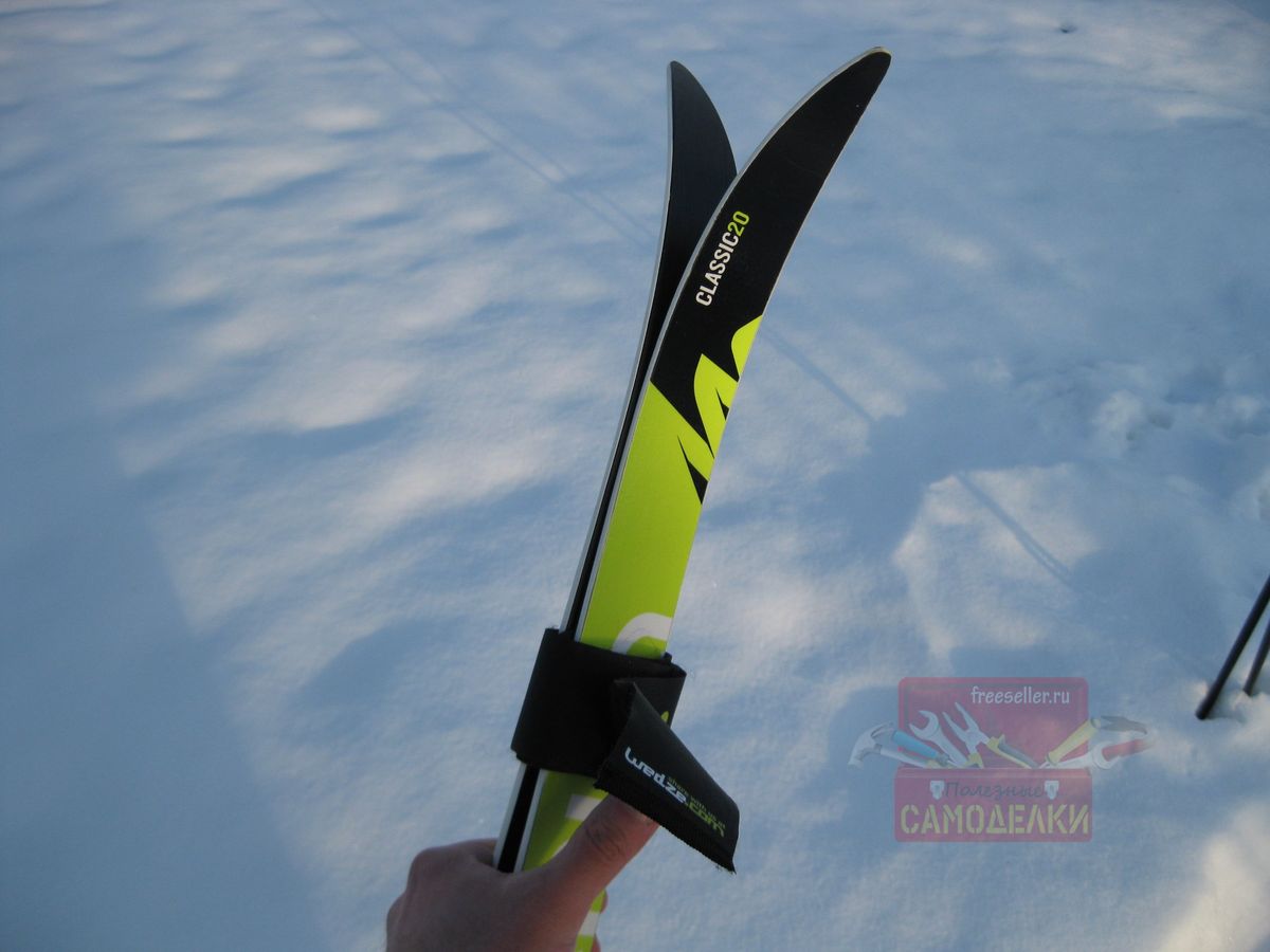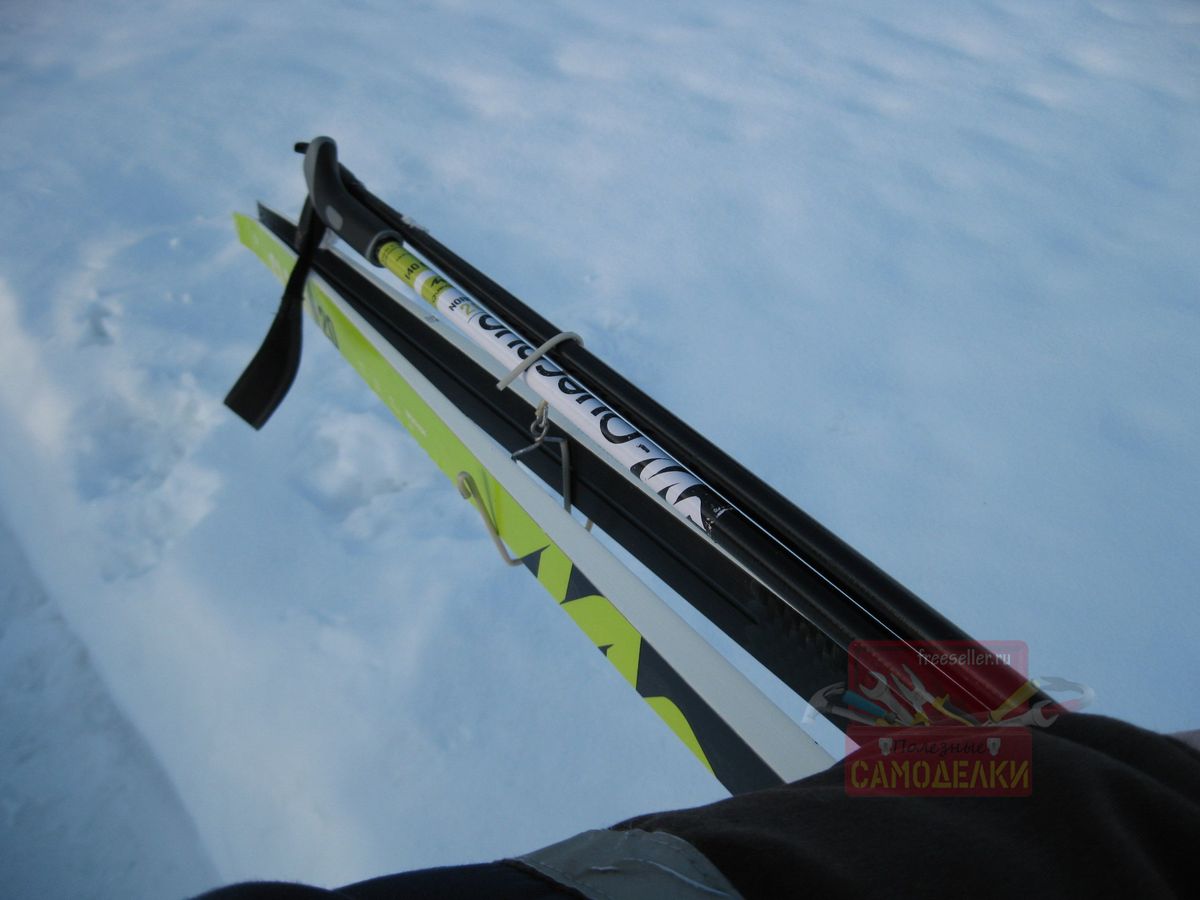Кстати, чтобы лыжи плотнее входили в развилки обеих частей переносного устройства, сами части можно слегка подвигать вдоль лыж и найти наиболее оптимальное положение.