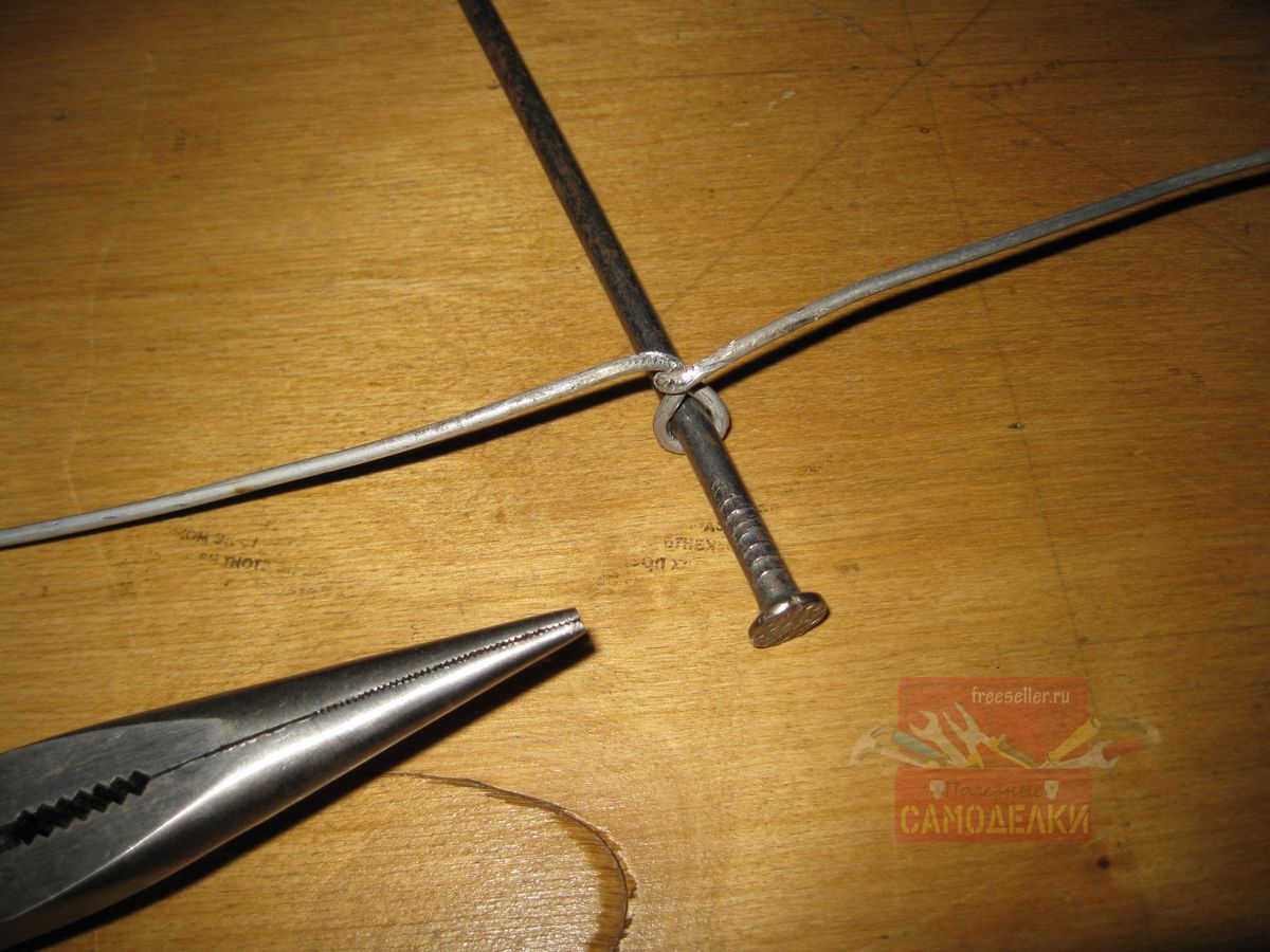 Сначала я откусил кусок проволоки длиной 35-40 см, и, выпрямив его, сделал в середине вот такую петлю, при помощи оправки из гвоздя.![]()