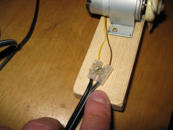 Провода электродвигателя с проводами от адаптера, я соединил при помощи клеммной колодки.
