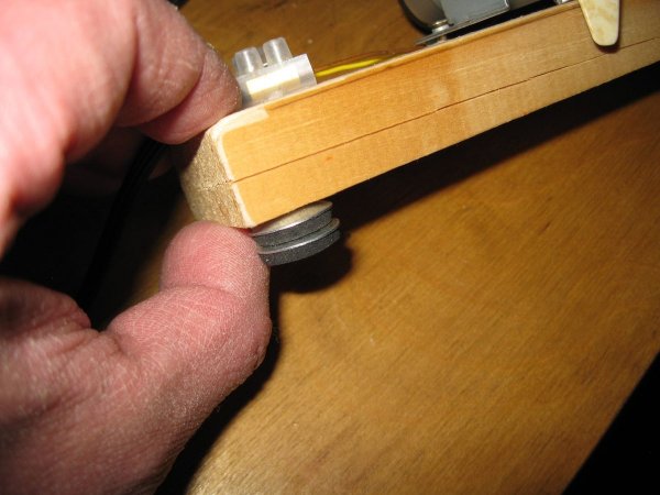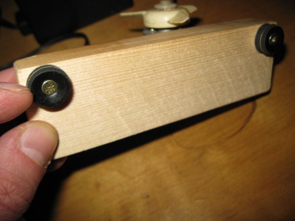 А чтобы струя воздуха от вентилятора стоящего на столе, была направлена прямо в лицо, я сделал снизу дощечки, две короткие ножки. Каждую ножку я сделал из двух шайб от кровельных саморезов, привернув их к дощечке двумя мелкими шурупами.
