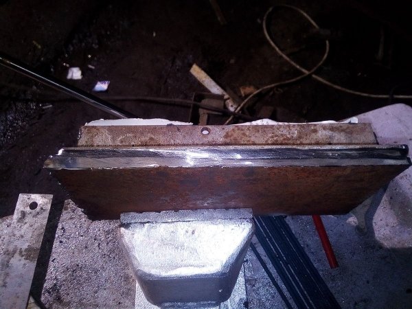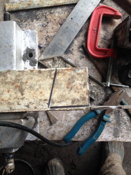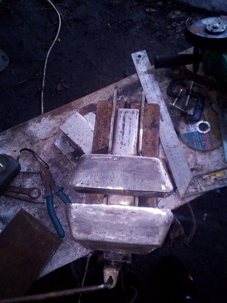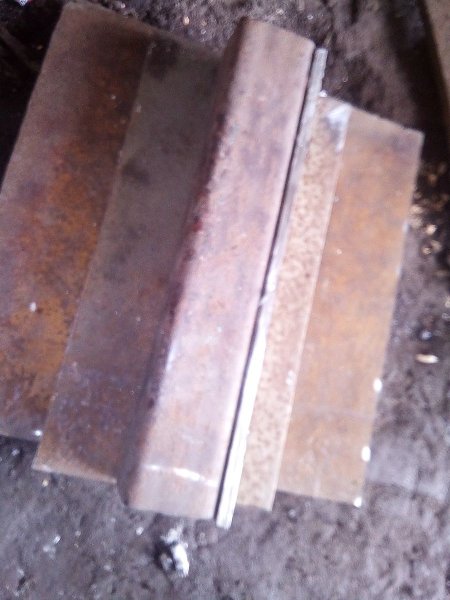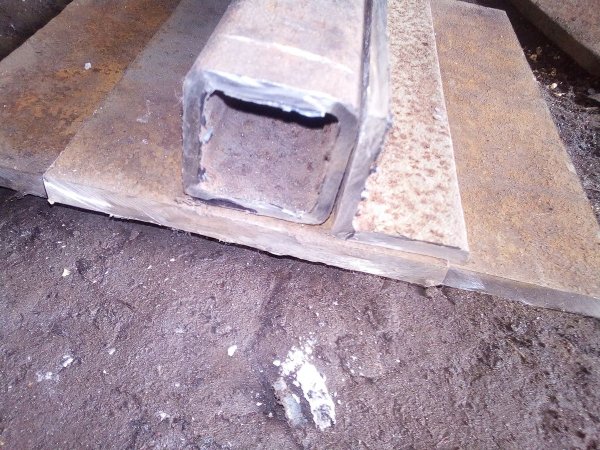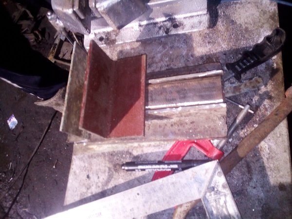На толстом листе металла была положена профильная труба, по бокам уголки и отпилено по этим размерам.