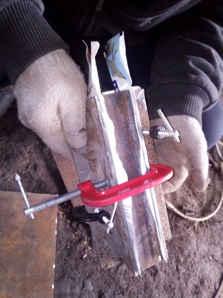 Дальше мы всё это стянули струбцинами, для зазора подложили с двух сторон между профилем и уголком лист бумаги согнутый в два, и это всё дело заварили.