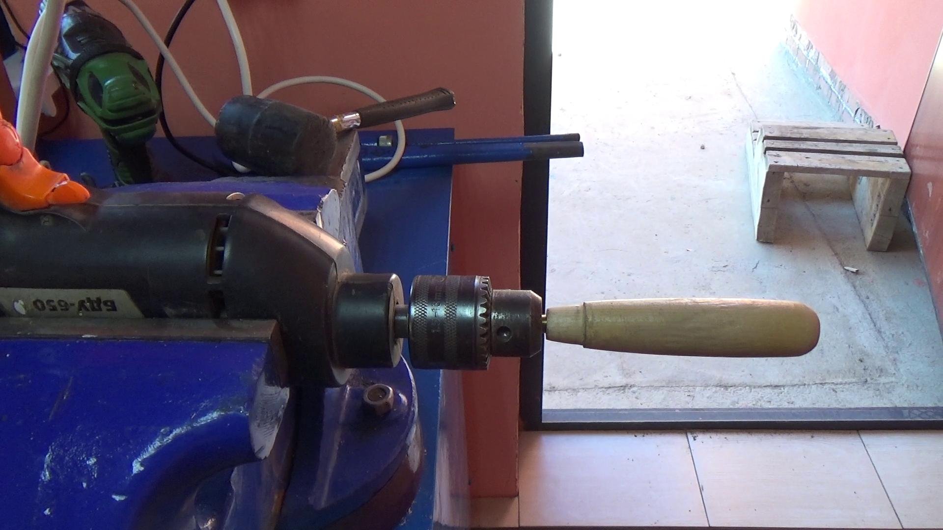 Затем так же в тиски зажимаем дрель, на кусок шпильки насаживаем ручку и шлифуем все наждачной бумагой.
