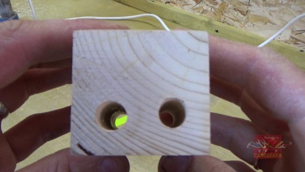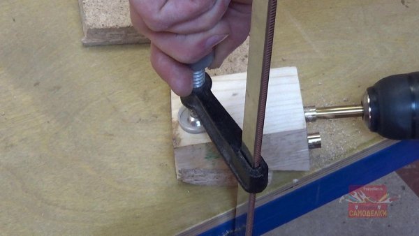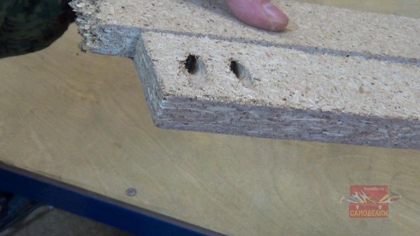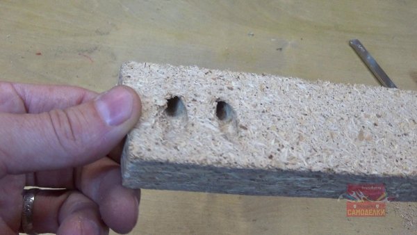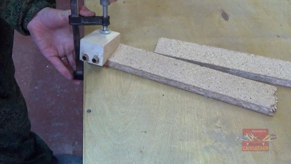 Теперь можно испытать кондуктор. Ставим его на кусок ДСП, прижимаем струбциной и можно сверлить отверстия.