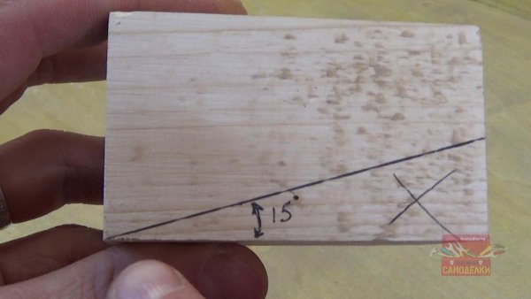 Затем необходимо под углом в 15 градусов отрезать нижнюю часть бруска.