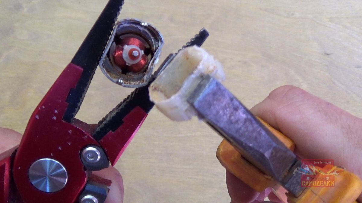 Отсоединяем все лишнее и при помощи пассатижей разламываем моторчик пополам.